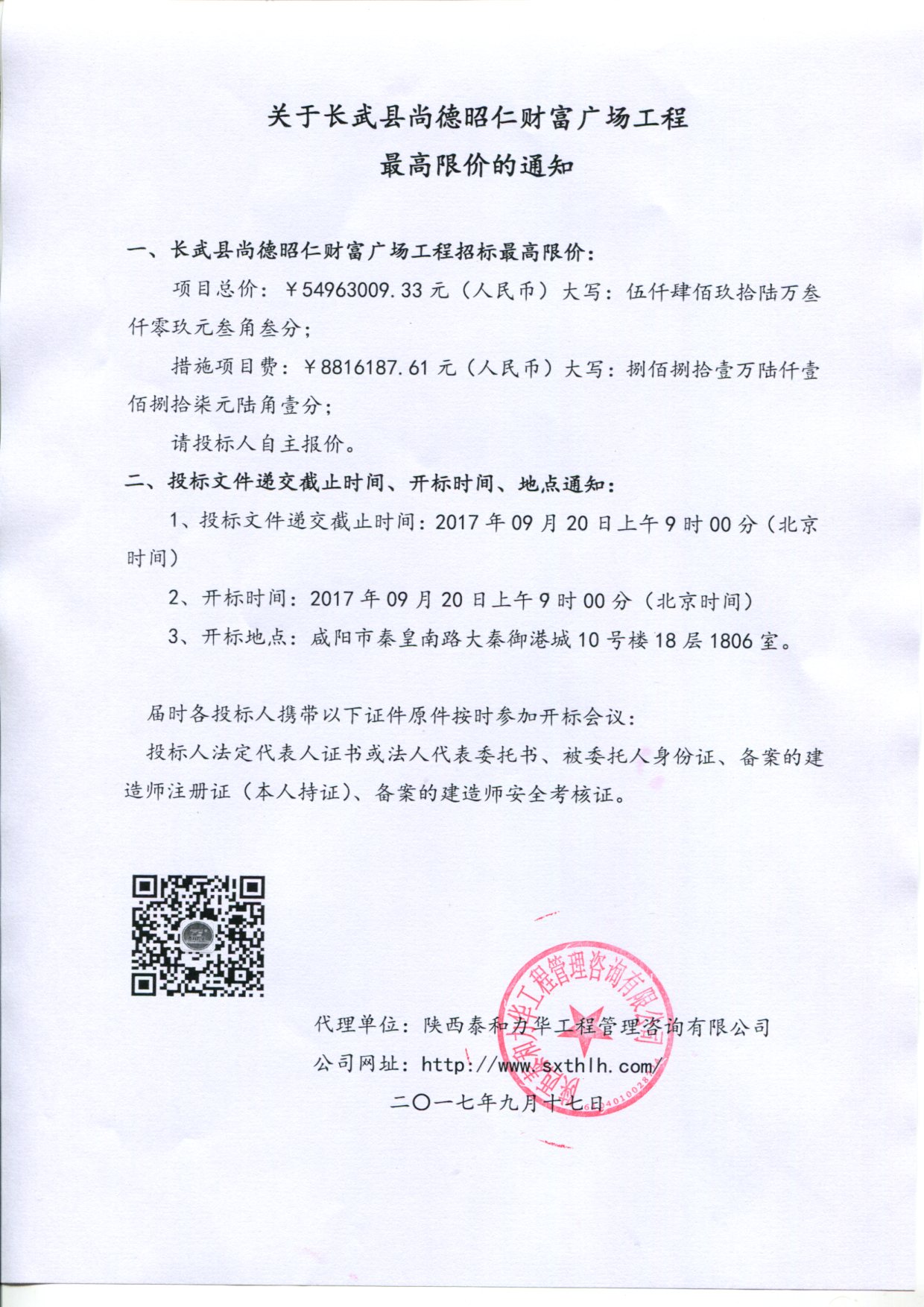 长武县尚德昭仁财富广场工程最高限价通知