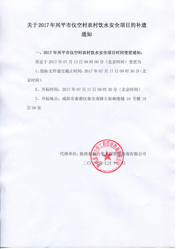2017年兴平市仪空村农村饮水安全项目(补遗通知)