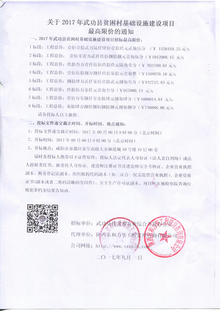 2017年武功县贫困村基础设施建设项目最高限价通知