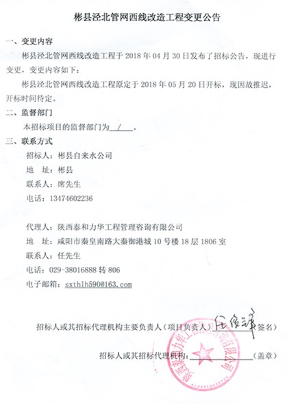 彬县泾北管网西线改造工程变更公告