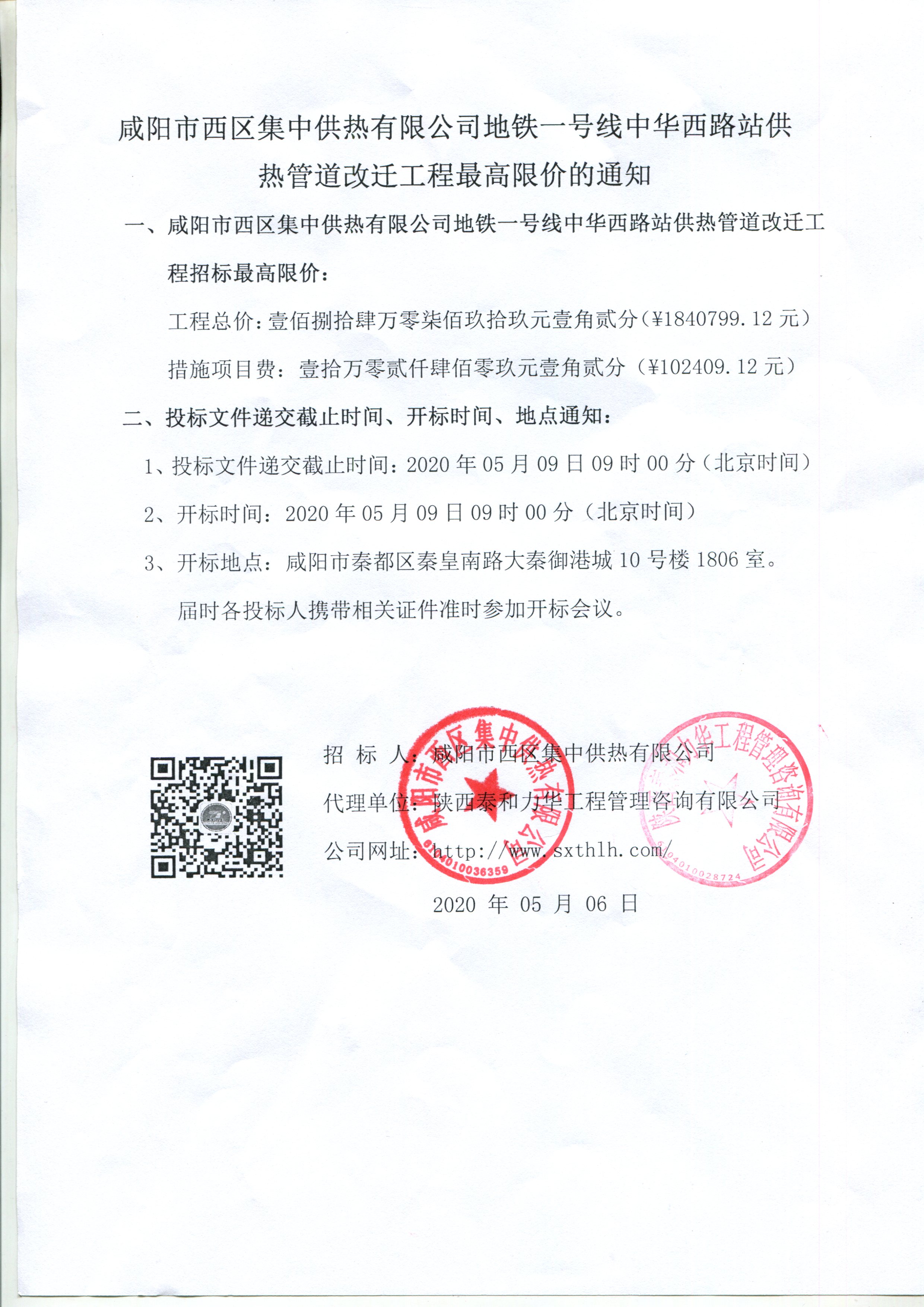 咸阳市西区集中供热有限公司地铁一号线中华西路站供热管道改迁工程最高限价的通知