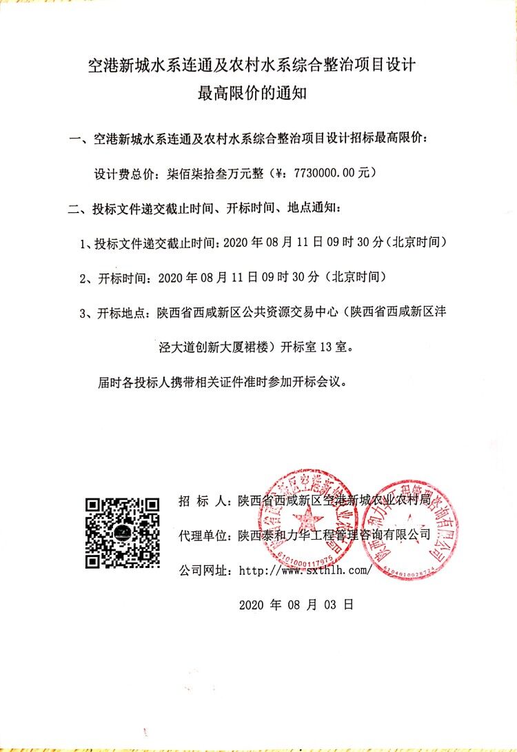 空港新城水系连通及农村水系综合整治项目设计最高限价的通知