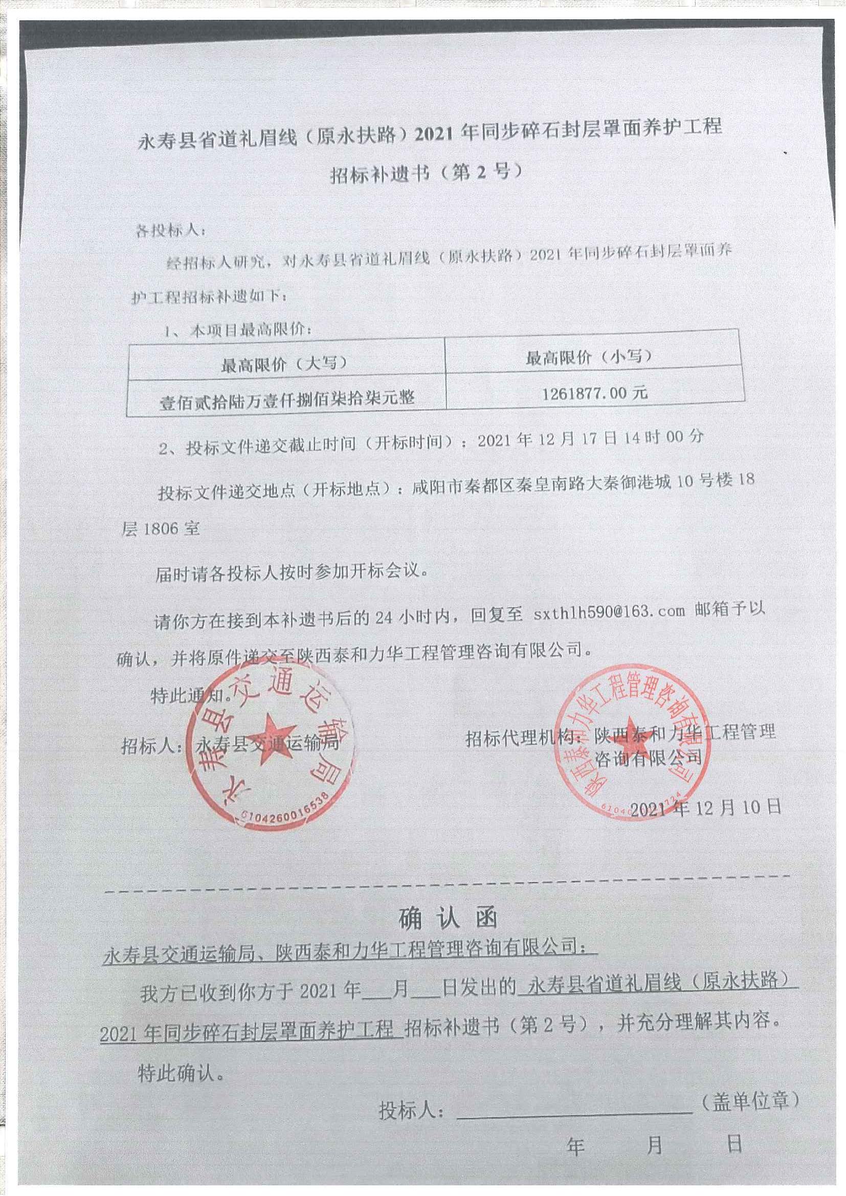永寿县省道礼眉线(原永扶路)2021年同步碎石封层罩面养护工程招标补遗书(第2号)