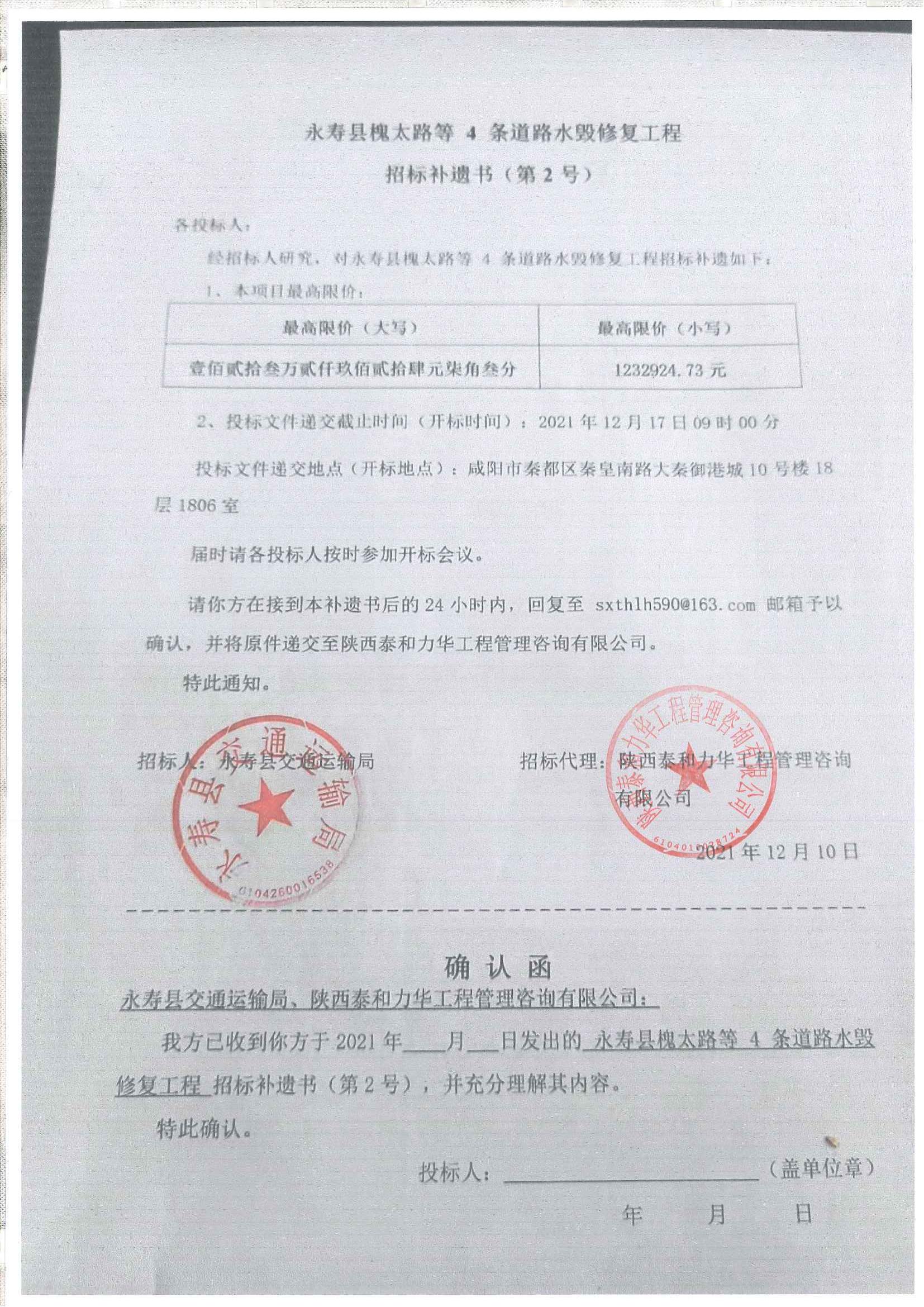 永寿县槐太路等4条道路水毁修复工程招标补遗书(第2号)