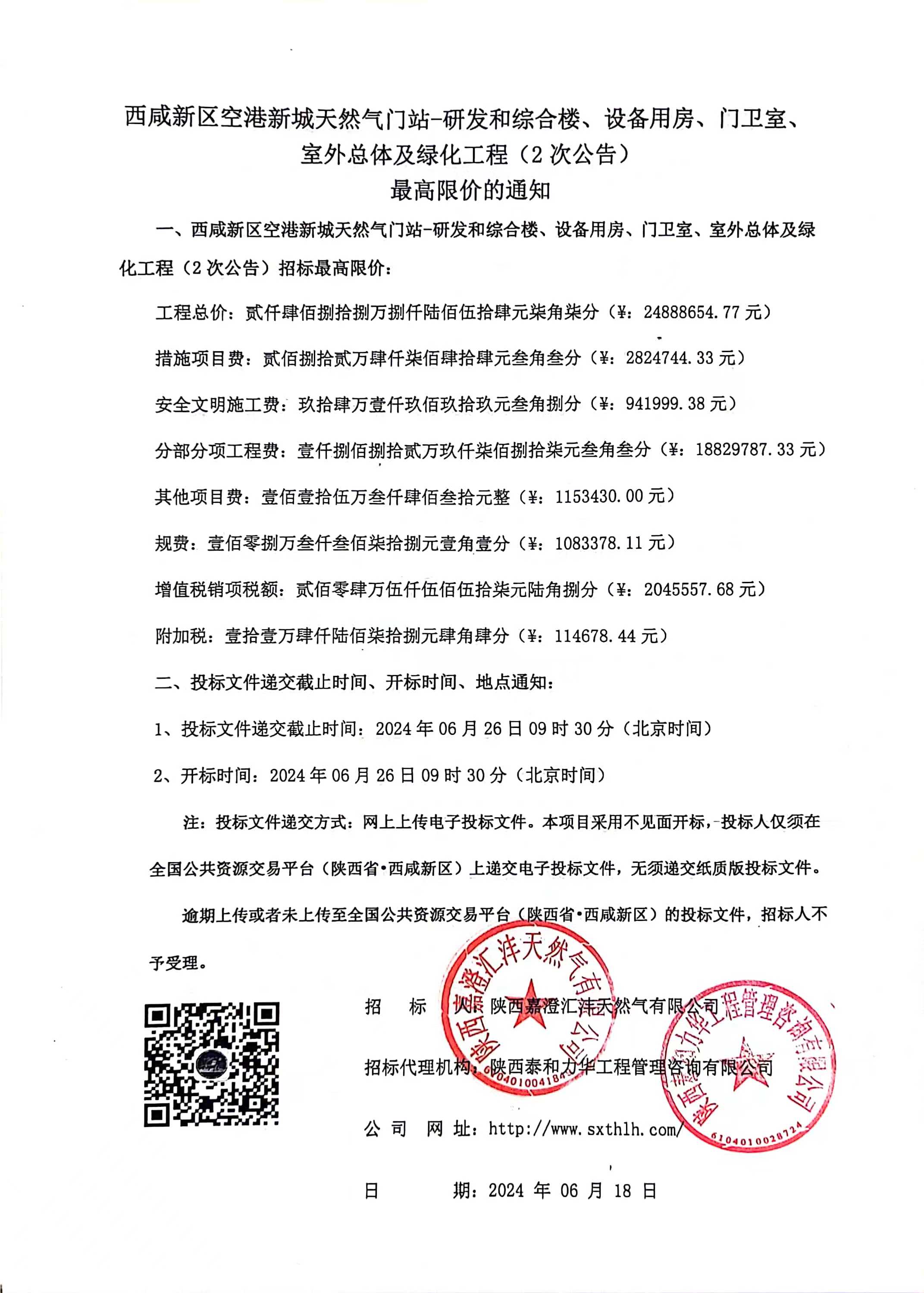 西咸新区空港新城天然气门站-研发和综合楼、设备用房、门卫室、室外总体及绿化工程(2次公告)招标最高限价